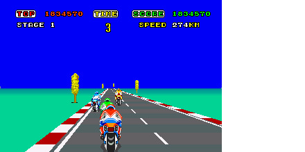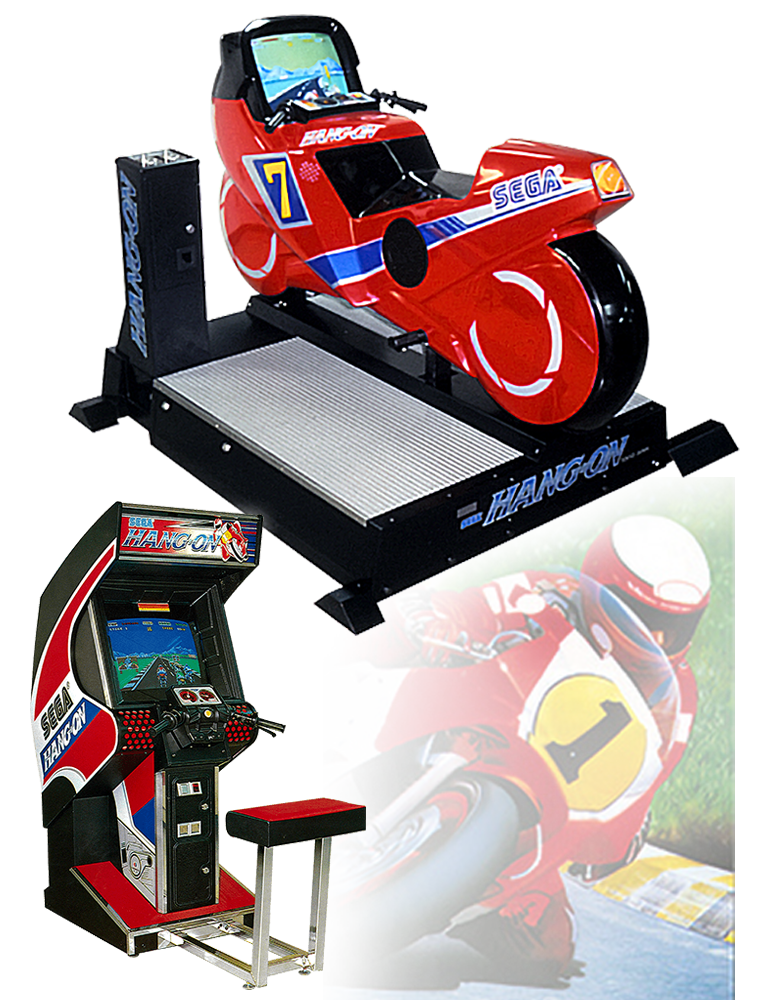 記念すべきセガ体感ゲーム第1弾のバイクレースゲーム。赤い大きなバイク型の筐体にまたがり、左右に傾けながらコーナーを曲がっていく。その筐体のインパクトと操作の斬新さは当時のプレイヤーを驚かせた。のちに複数の家庭用ゲーム機にも移植作が登場し、難易度別に4つのコースが選択できるようになった続編『スーパーハングオン』も1987年に登場している。