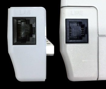 ケーブル接続部分は、標準装備モデルに「LINE」と書かれているのに対し、本アダプタは「LAN」と表記されている。